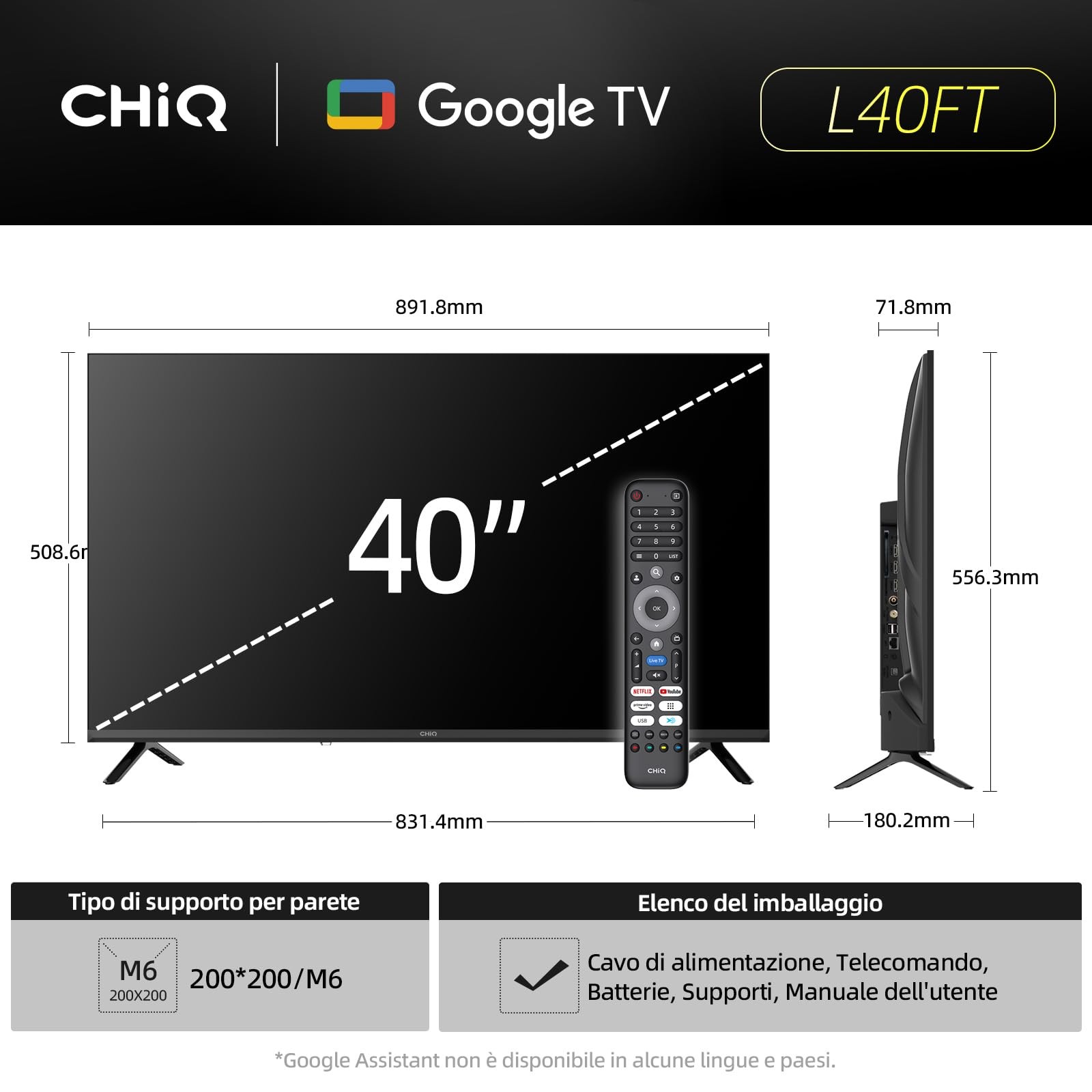 Smart TV CHiQ L40FT 40" (100 cm): Google TV OS per Netflix/Disney+, Full HD HDR10 immagini vivaci. Dolby Audio & dbx-tv audio cinema. HDMI/Bluetooth 5.0, <20ms gaming. Supporta segnali DVB-C/T/T2/S/S2.